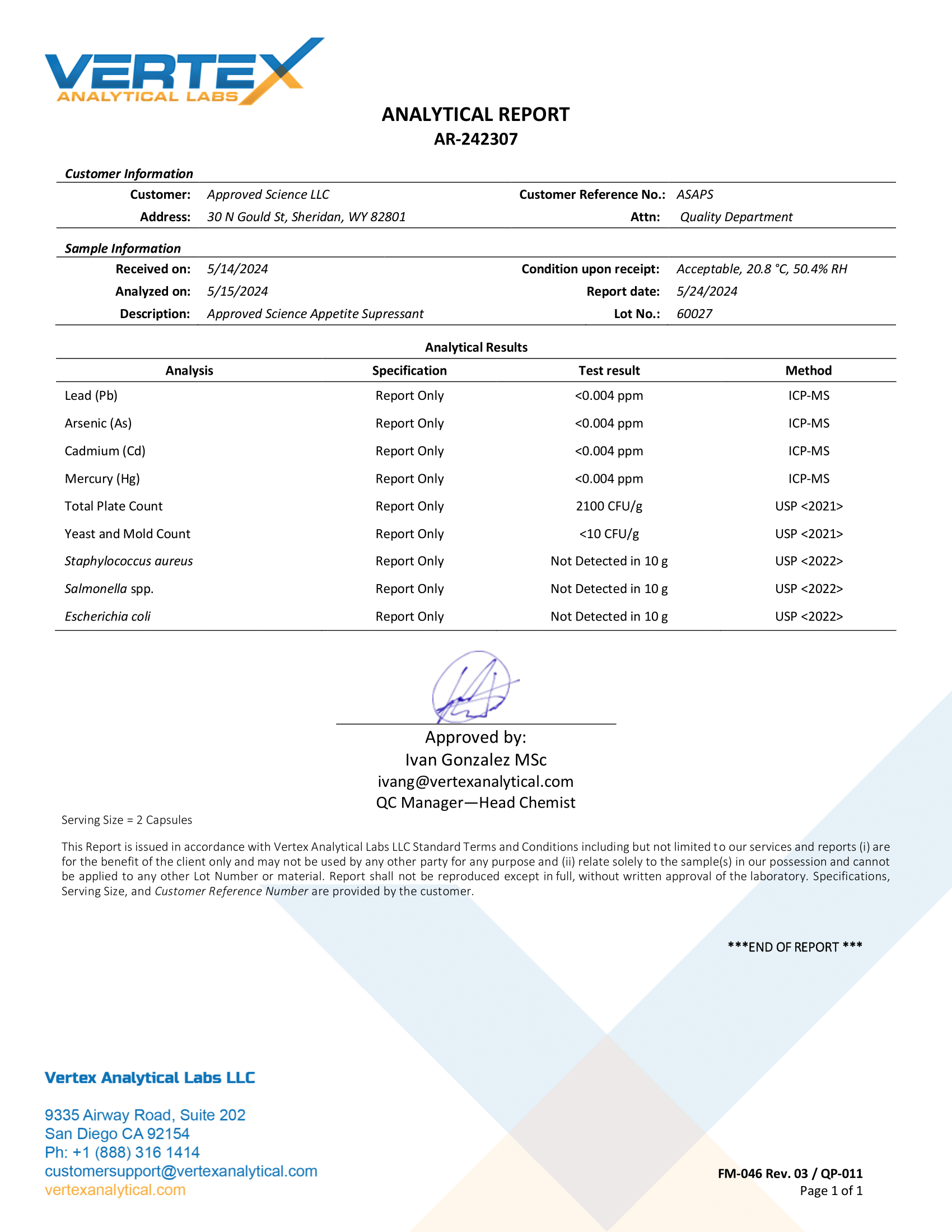 OF APPROVED SCIENCE® APPETITE SUPPRESSANT