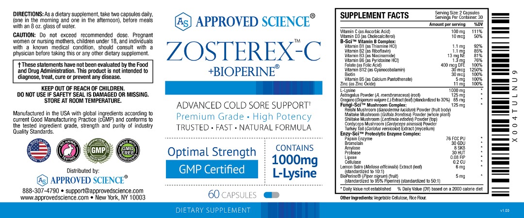 is an expertly crafted cold sore supplement that is formulated to target the uncomfortable symptoms associated with cold sores, and provide a fast-working healing solution. Packed with crucial vitamins and minerals, Zosterex-C™ is a unique all-in-one solution to help the body combat the herpes simplex virus (HSV-1), support faster healing, and reduce the chance of future outbreaks. Zosterex-C™ is produced in a top-quality, cGMP certified and FDA licensed laboratory environment under the most rigorously professional conditions.
